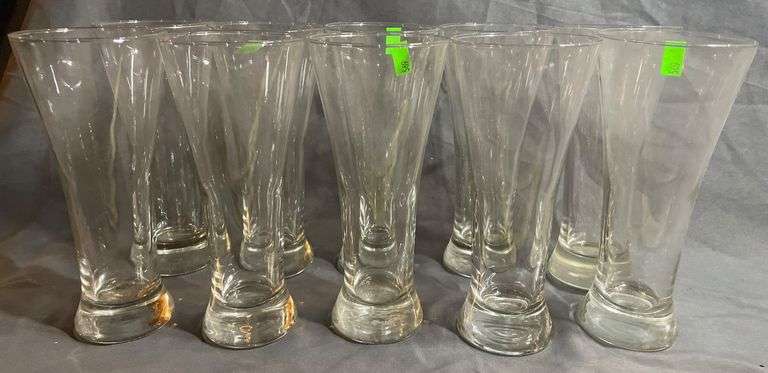 10 clear glass tumblers with a rounded base and flared lip, approx. 7.5in. tall each. Designed for serving beverages. Minor wear consistent with prior use.