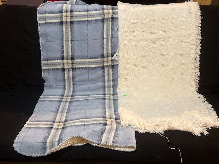 Includes 2 blankets: 1 blue plaid throw with plush texture, and 1 cream fringed blanket with soft fabric. 43.5”x 63.5” & 48.5” x 57.5”