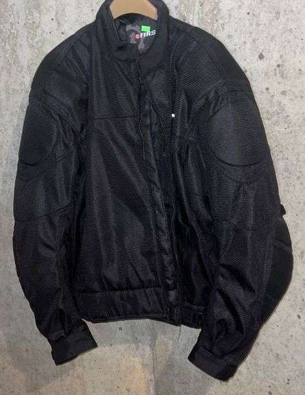FirstGear black riding jacket featuring reflective accents on the back. Design includes adjustable cuffs, zippered front closure, and mesh ventilation for comfort. Label indicates size 4XL.