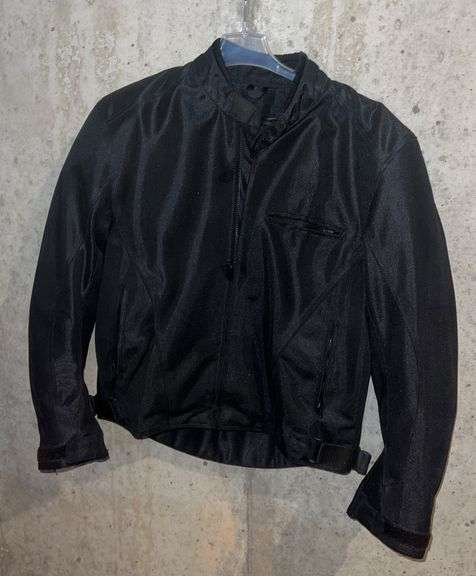 River Road black mesh motorcycle jacket with zippered front closure and interior lining. Features adjustable waist straps and front pocket. Made in Pakistan. Size XXL.