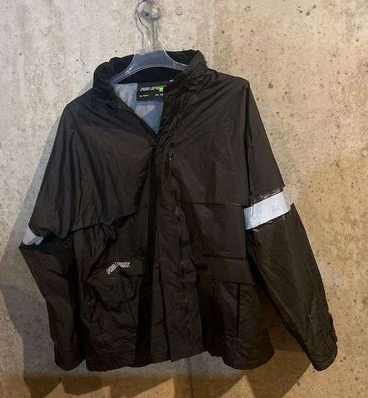 Black Pro Sport 'Dry Bones' jacket in size XXL, featuring reflective stripes on sleeves, an elastic waist, and a lightweight design. Label states 'Dry Bones.'