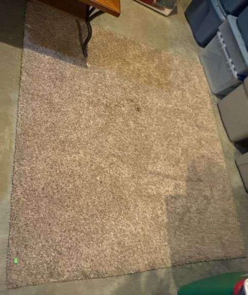 Rectangular beige area rug measuring 69”x72”. White underside with stitched edging intact.
