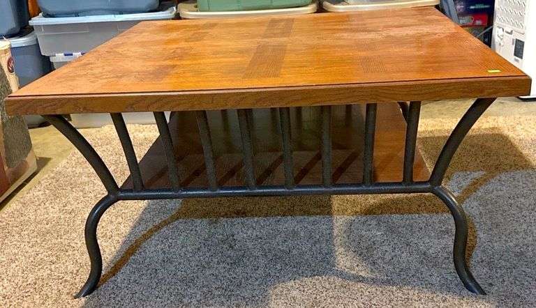 Square wood top coffee table with a patterned surface. Features curved metal legs and a wood lower shelf for additional storage. Dimensions are 38”x38”x18”.