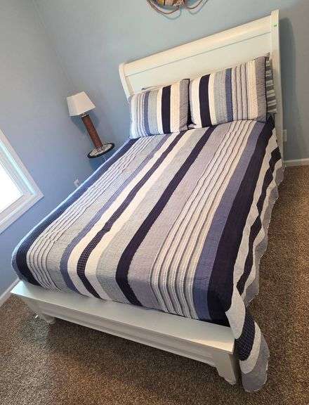 White bed frame featuring a sleigh-style headboard and matching footboard. Includes turned legs and white painted finish. Dimensions: 56" x 82" x 28", headboard 53" H.