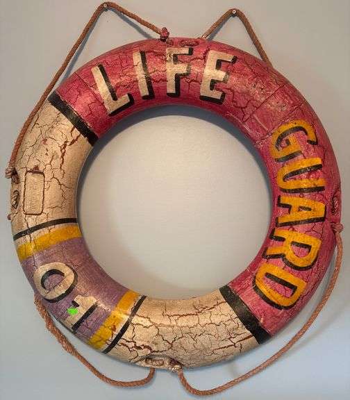 Lifeguard life ring with red, yellow, and purple painted accents. Features hand lettering and an attached rope. Dimensions: 28” x 4” x 28”.