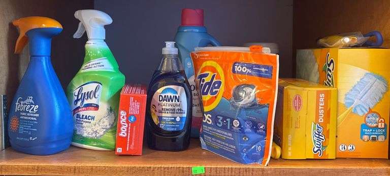 Clorox wipes, Lysol cleaner, Dawn dish soap, Swiffer dusters, Tide Pods, Bounce sheets, Downy fabric softener, and Febreze spray. Items feature various cleaning and freshening items. Partial use.