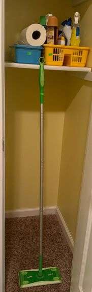Swiffer green mop with a 51″ silver pole and green handle. Includes cleaning supplies like Lysol spray, Clorox cleaner, Old English polish, and mopping cloths. items show signs of use.