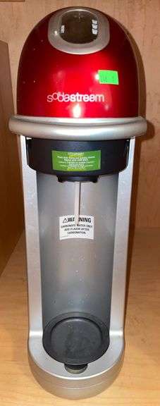 SodaStream machine with red and silver casing. Includes a 60L CO2 cylinder. Designed for creating sparkling beverages at home. Features a compact design and functional components. Manufacturer’s details and care instructions included on the device.