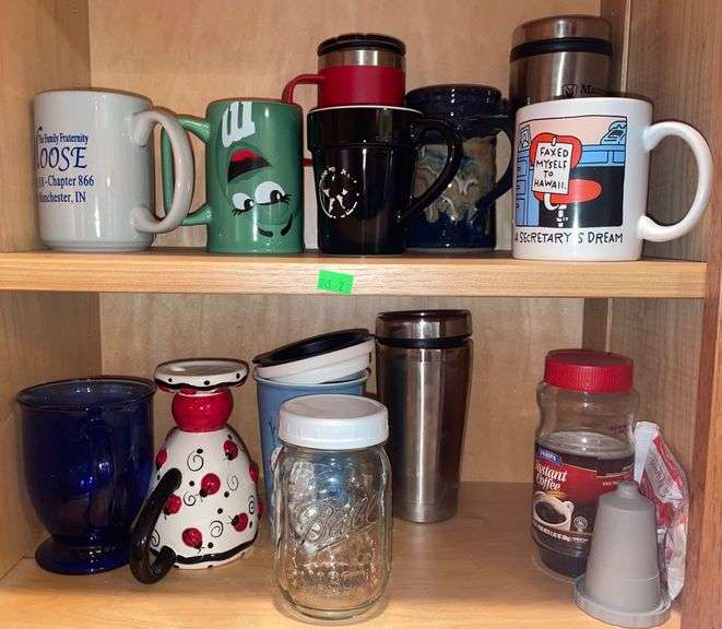 12 mugs and drinkware pieces, inc. glass, and stainless steel designs. Includes mugs with printed designs, solid-color finishes, and branded logos. Makers include Burton & Burton and various branded designs.