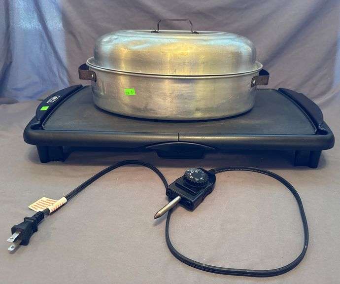 Bella electric griddle featuring a detachable 23” cord, adjustable temperature control, and non-stick cooking surface. Includes 14”x6” aluminum covered roaster. Surface and components show wear consistent with prior use.