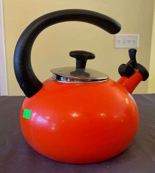 Rachael Ray red tea kettle with a capacity label of 2QT. Features a black, curved ergonomic handle, spout lever, and matching lid handle. Includes a stainless steel lid and pour spout cover. Moderate surface wear present on the base.