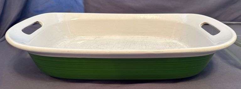 Includes a CorningWare green stoneware bake dish (3qt/2.85L) with white interior, plus a Pyrex clear rectangular glass dish marked 213. Slight wear visible on both items.