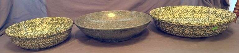 3 bowls, 2 marked Gerald Henn Roseville, OH, 1 marked KS 04. Green spongeware and speckled glaze finishes. Measurements are 9.5”, 12.5”, and 13”.