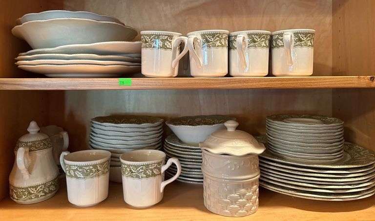 J&G Meakin Renaissance dinnerware collection with green floral design. Includes 12 bowls (6''), 12 plates (6''), 12 plates (7''), 12 mugs (3''), 3 plates (10''), 1 serving plate (12''), 1 serving bowl (8.5''), and 1 bowl (10''). Overall condition consistent with prior use.