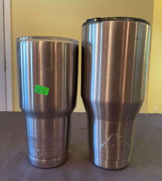 2 stainless steel insulated tumblers, 1 by YETI and 1 by RTIC, approx. 7-8 in. tall, with clear plastic lids. Both show light wear.