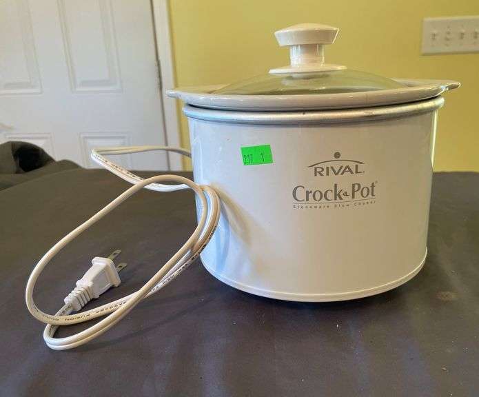 Rival Crock-Pot model 3215 slow cooker with removable ceramic insert and glass lid. Measures 8”x5”. Features a 120V AC power cord. Made in China. For household use only.