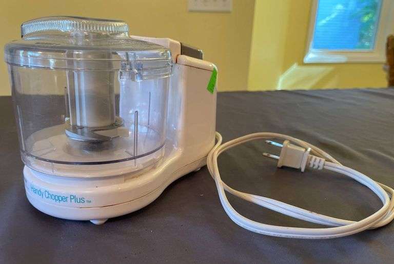 Black+Decker Handy Chopper Plus food processor with a clear plastic bowl, metal blade, and electric cord. The base features non-slip feet and model details are on the underside. Includes all visible components.