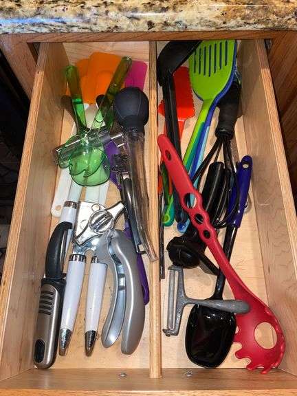 Collection of kitchen utensils including silicone spatulas, serving spoons, whisks, peelers, and can openers. Notable brands featured included KitchenAid.