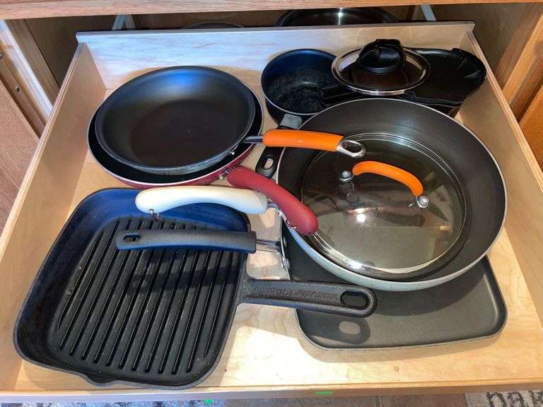 Cookware lot featuring Paula Deen porcelain nonstick frying pans (11 in. and 9 in.), Emeril Lagasse cast iron grill pan (approx. 10 in.), and additional frying and baking pieces.