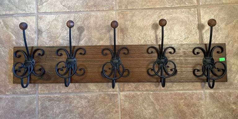 Wall mount coat hanger measuring 33.5”x6”. Features wood backing and 5 black metal hooks with decorative scroll designs. Ball-style ends on hooks for added function.
