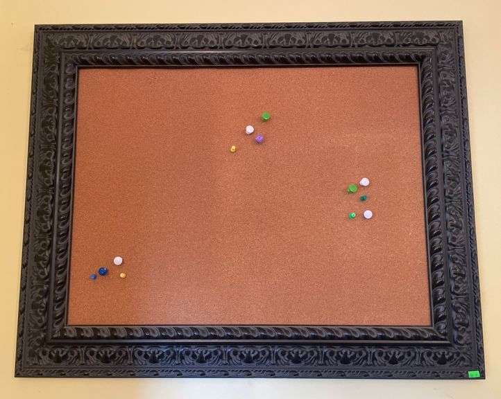 Cork bulletin board measuring 35”x28” and bordered with a decorative black frame featuring detailed scrollwork.
