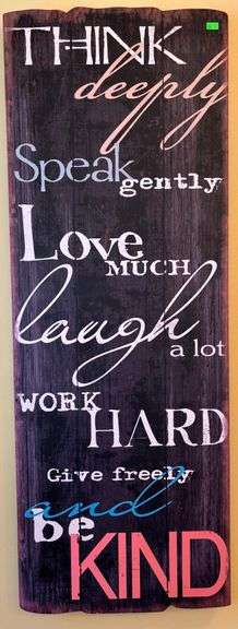 Rectangular wall plaque featuring inspirational phrases and multicolor lettering on a textured surface. Includes words like ‘Think deeply,’ ‘Love much,’ and ‘Be kind.’