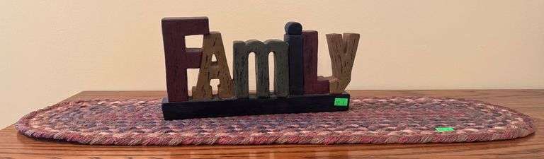 Painted wooden-style figurine spelling ‘Family’ on a base. Includes a multicolored braided table runner. Figurine measures 11”x1.5”x6”. Runner measures 28”x8”.