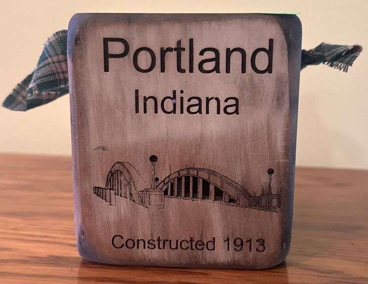 Square wood candle holder featuring ‘Constructed 1913’ inscription on one side, graphic of a bridge, wire handle with plaid fabric accents.