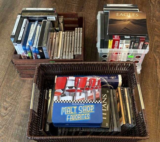 DVDs, Blu-rays, and CDs in 3 storage bins, Inc. movie titles such as ‘Braveheart,’ ‘Gladiator,’ and ‘Cinderella Man,’ as well as CDs like ‘Malt Shop Favorites’ and ‘Eagles – Farewell Tour.’