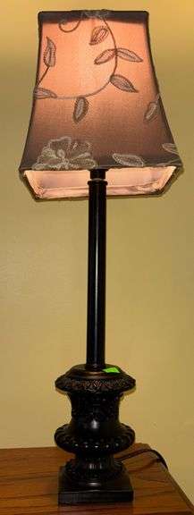 Lamp featuring a black metal base with ornate detailing and an embroidered fabric shade in a floral pattern. Standard bulb socket with pull switch mechanism.