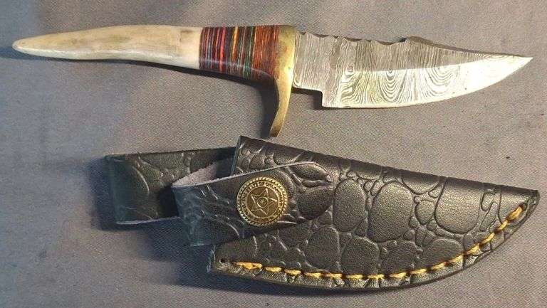 LOT 208 - Damascus Steel Blade Knife w/ Bone-Like/Resin Handle & Black Leather-Like Sheath 3" Blade