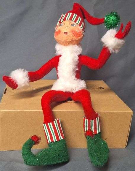Annalee 14in poseable elf doll wearing a red and green outfit accented with glitter and faux fur trim. Features striped details on boots and hat.