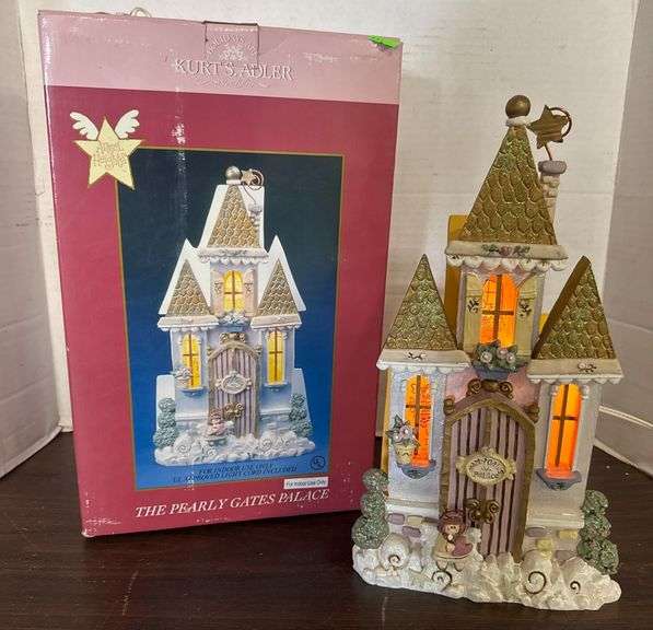 Kurt S. Adler Inc. Fairy Lights Palace, hand-crafted in China, featuring a light-up design with a wired electrical plug for illumination. Constructed with resin-like materials, decorated with intricate detail, metallic accents, and a decorative box included. Approx. 11 in. tall.