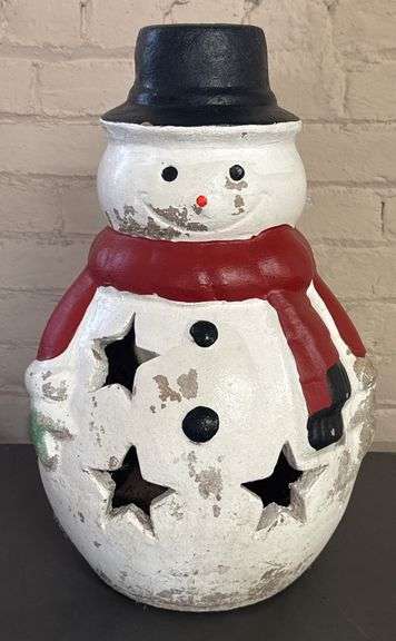 Snowman-shaped lantern, 20" tall, featuring star-shaped cutouts for light display. Includes red scarf and black hat details. Rear opening for candle or lighting placement.