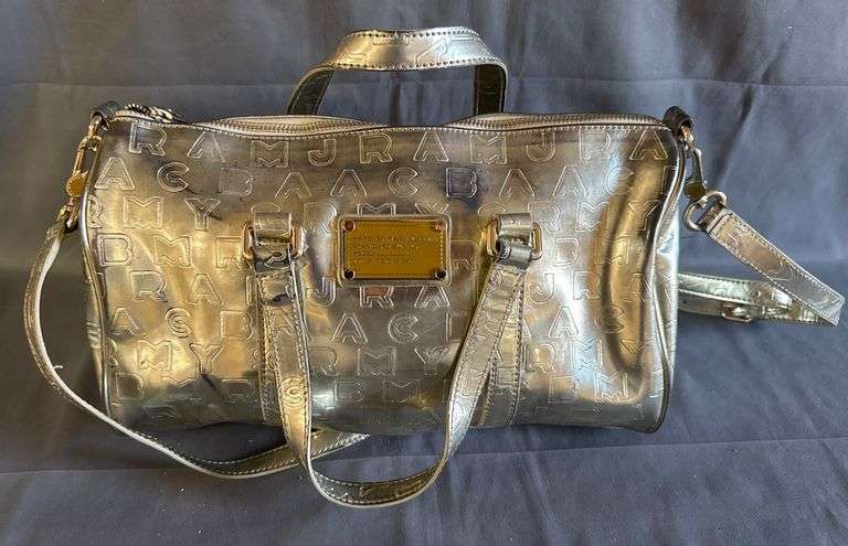 Silver-tone metallic leather duffle bag featuring raised monogram pattern, dual top handles, detachable shoulder strap, and gold-tone hardware. Branded plaque on the front reads "Marc by Marc Jacobs Standard Supply Model... Type: Workwear." Approx. 14 in. length as per image measurement.