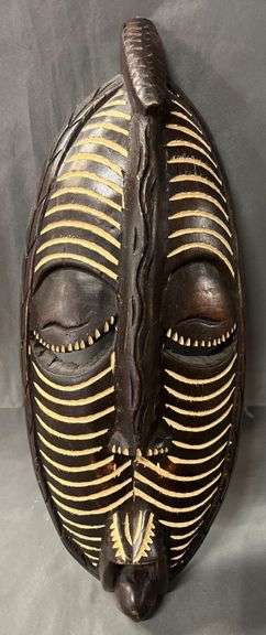 Carved mask featuring curved motifs and painted striped accents. Measures 15 1/2" in height. The back is hollowed with eye and mouth openings.