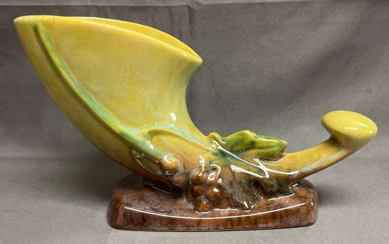 Roseville pottery cornucopia vase featuring a yellow body with green leaf accents and brown base. Marked "Roseville U.S.A." on the underside. Approx. 8 1/2 in. length.