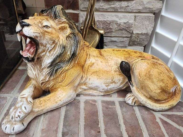 Painted lion sculpture depicting a roaring lion in a reclining pose. Features detailed fur texture and painted accents. Marked ‘Italy’ with additional labeling. Measures 25″x15″x13″.