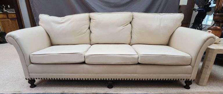 Henredon Leather Co. sofa measuring 88"x35"x31". Features cream leather upholstery, rolled arms, nailhead trim accents, 3 removable seat cushions, and turned wood legs. Manufactured by the Henredon Upholstery Division.