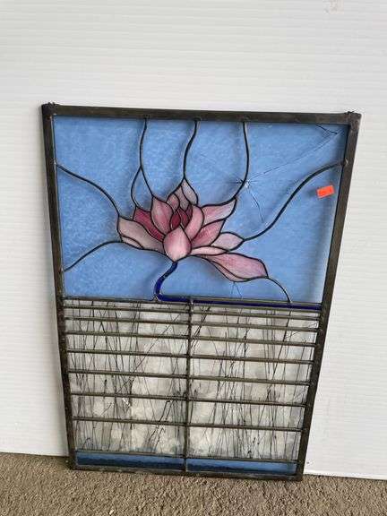 Rectangular stained glass panel featuring a pink flower on a blue background, framed in metal. The lower portion has a textured, light-patterned design.