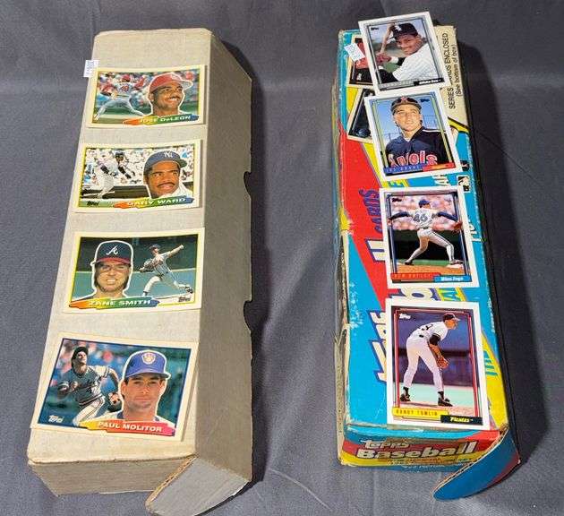 2 boxes containing baseball cards. Each box highlights cards on the exterior, with cards affixed measuring 3.5”. Includes players such as Paul Molitor, Ozzie Smith, and others. Boxes exhibit wear with visible handling marks.
