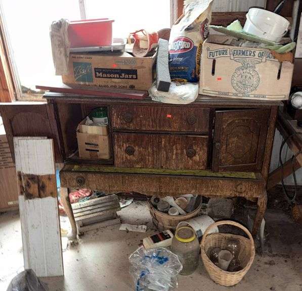 Carved wood cabinet featuring 3 central drawers, 2 side compartments with doors, and resting on carved legs. Includes various household contents such as baskets, glassware, and assorted items.