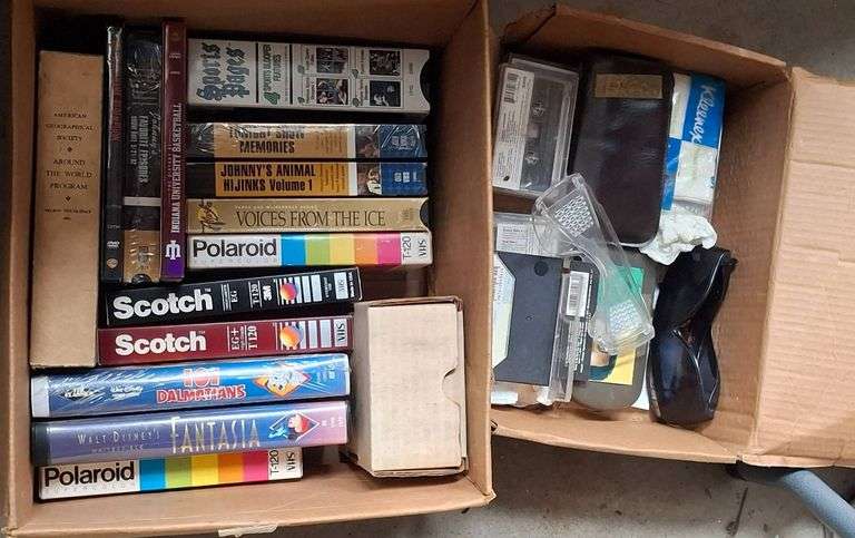 Includes multiple VHS tapes with various genres and brands, audio cassettes, eyewear, and accessories. Notable brands include Polaroid and Scotch.