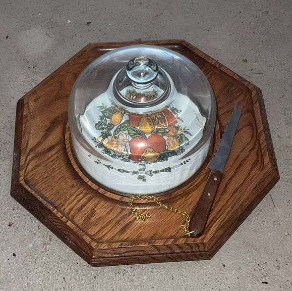 Octagonal cheese tray with a cork-lined bottom, plate featuring a fruit design, matching glass cover, and serrated cheese knife secured with a chain. Manufactured by Julie Pomerantz, Inc., model No. 1666L.