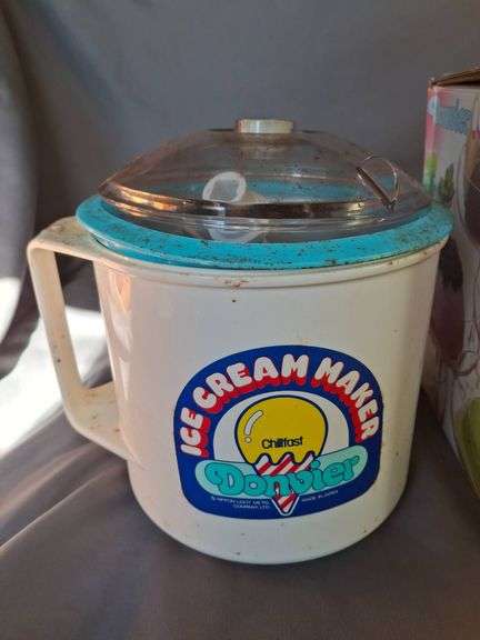 Manual Donvier ice cream maker featuring a plastic exterior, metal canister, and mixing paddle. Includes original packaging. No electricity or salt required for operation.