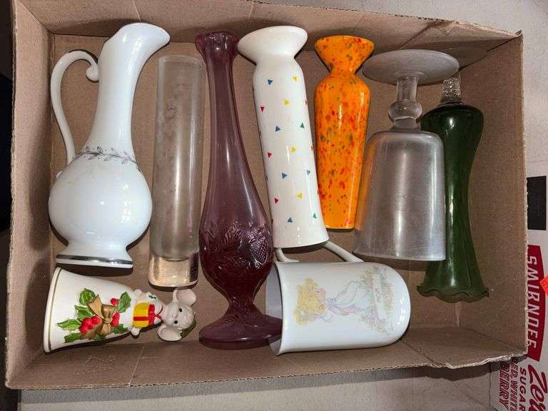 Vases, a bell adorned with holly, and a mug with ‘Mom’ design. Features multiple colors and patterns. Some items marked with branding inc. Schmid