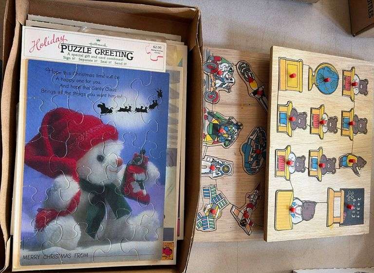 Puzzles comprising Disney characters, children’s educational themes, and space illustrations. Includes knob puzzles and framed tray puzzles with varying imagery and designs.