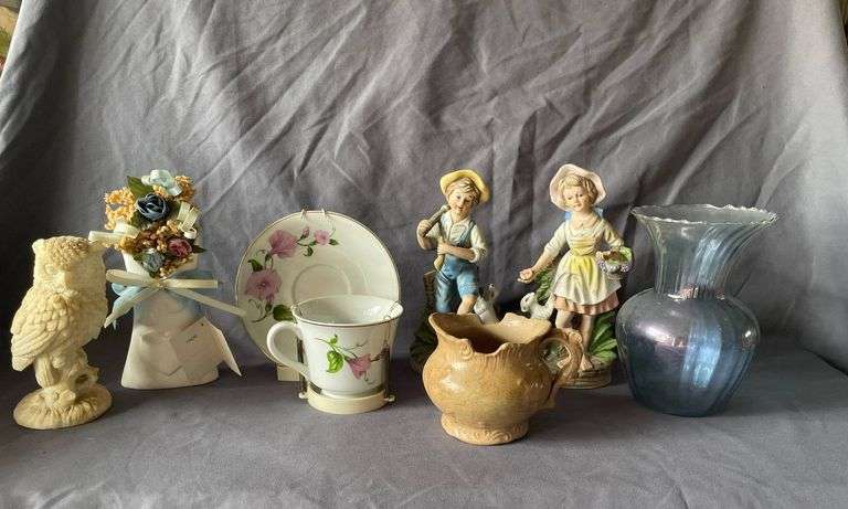 Includes 2 porcelain boy and girl figurines, a floral teacup with saucer, a owl, a flower-adorned bell, a glass vase with ruffled edge, and a small jug marked ‘Lenoir’ on its base.