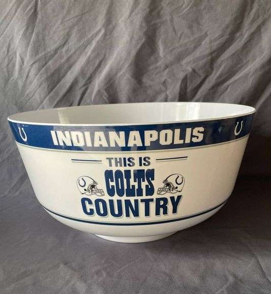 Indianapolis Colts NFL officially licensed party bowl made of 100% FDA-certified melamine. Features team branding, dishwasher-safe construction, and bold team graphics. Approximately 14 in diameter.
