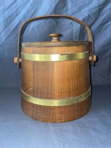 Wood ice bucket featuring brass bands, a fitted lid, and a sturdy handle. Interior lined. Marked by Consolidated Cigar Corp. Approx. 7 in tall.